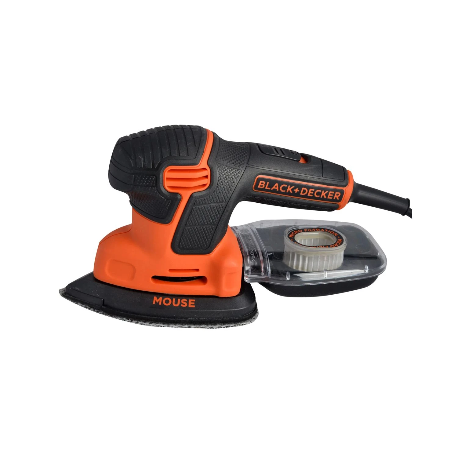 The Black & Decker KA2500K-GB Compact Mouse® Sander has a compact design with 3 separate rubber gripping areas that allow for optimum control. It has a micro filtration dust canister for excellent dust collection and a dust sealed slide switch for reduced fatigue during continual operation.