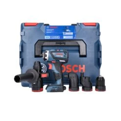 The Bosch 18v Professional FlexiClick Drill Driver is designed for professionals who want a high-quality tool that redefines their limits to get the tough jobs done. This robust drill/driver delivers the performance you expect in the size you want. It has two-speed settings, for quick jobs and precision work. It starts with a magnetic bit holder for basic driving. The four attachments – a locking bit holder, a keyless chuck, an offset angle and a right angle – each attached to the tool securely and easily with the One-Click interface. The right angle attachment is for tight spaces, and it works with all three other adapters. The offset angle attachment delivers precise screwdriving close to edges. Both of these attachments rotate to 16 positions without removing them. The locking bit holder attachment locks hex bits for high-torque drilling, while the keyless chuck provides locked-in drilling.