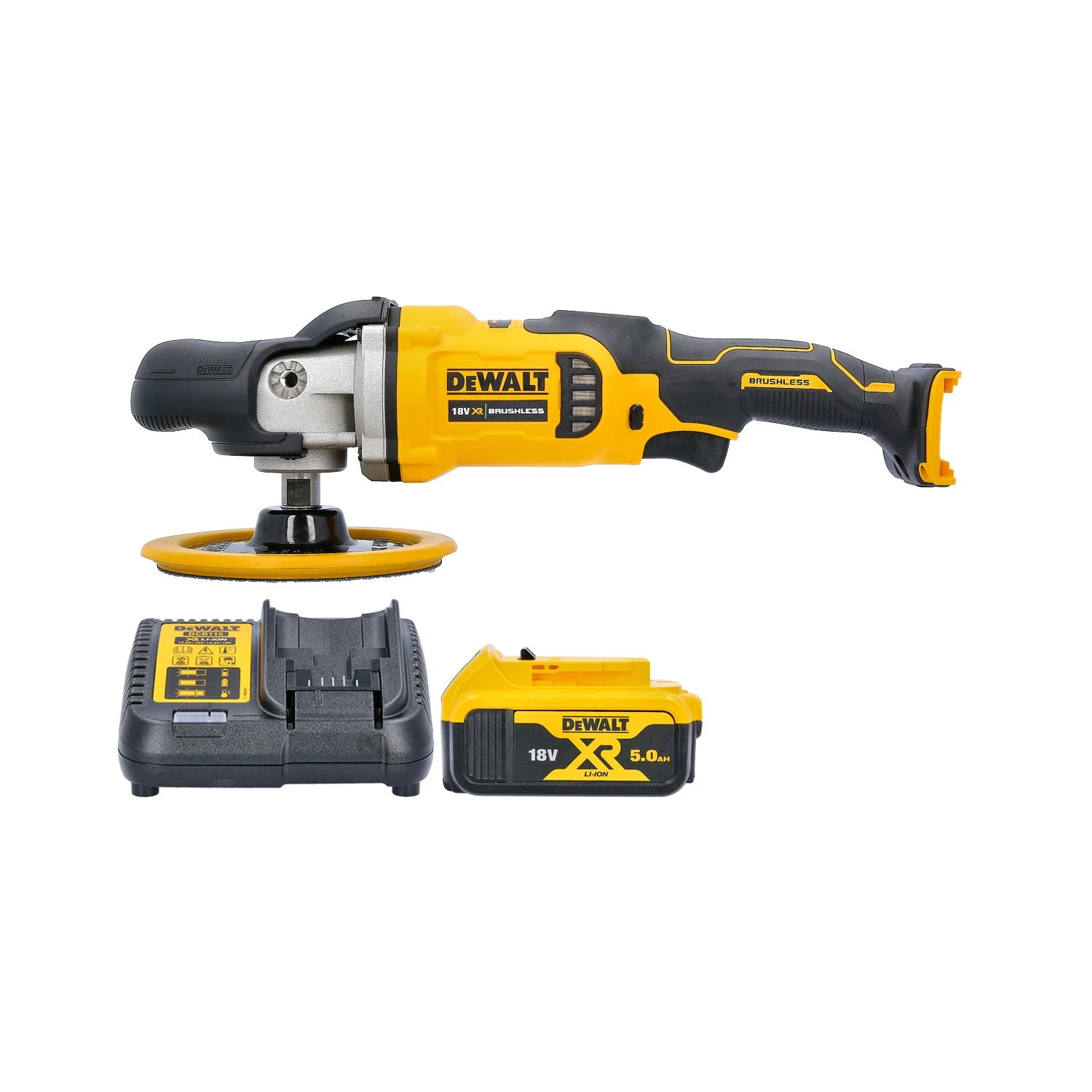 The DeWalt DCM849 rotary 18v cordless polisher for body shops, boat builders, stone masons and solid worktop installers. Used for car body repairs, vehicle valet services, boat repairs/polishing, Ornamental stoneworks – grave stones etc, kitchen fitters/solid worktop installers/manufacturers. Featuring a powerful 18v brushless motor so the unit will not bog down or stall in heavy load applications. The variable speed dial allows for quick and convenient speed changes for preference or application. The ergonomic slim rubberized gripping area allows for comfortable and fatigue free use over extended periods.