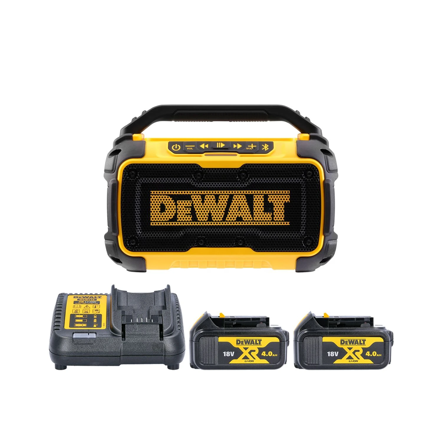 The DeWalt DCR011 10.8v / 18v / 54v Bluetooth Speaker produces high-fidelity audio out of the high-quality speakers. The bass port maximises bass and range and the Bluetooth carries a range of up to 30 meters, you can stream audio from a mobile or plug-in directly with an aux cable. The carry handle and hang system along with an over moulded side bumper and a metal speaker grill gives the Dewalt DCR011 Bluetooth Speaker portability and durability for transport and use on the site.