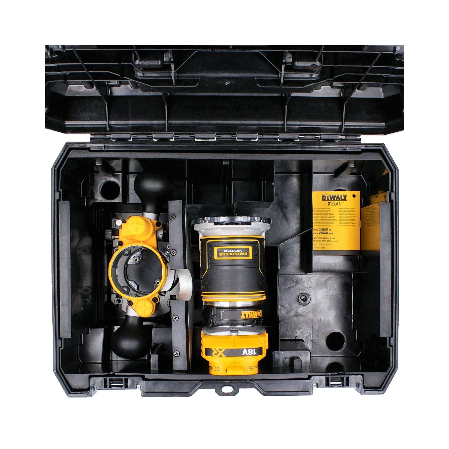 The first router available on the XR cordless platform, the DCW604NT-XJ comes with interchangeable fixed or plunge bases and has quick release tabs to enable them to be swapped over quickly and easily.