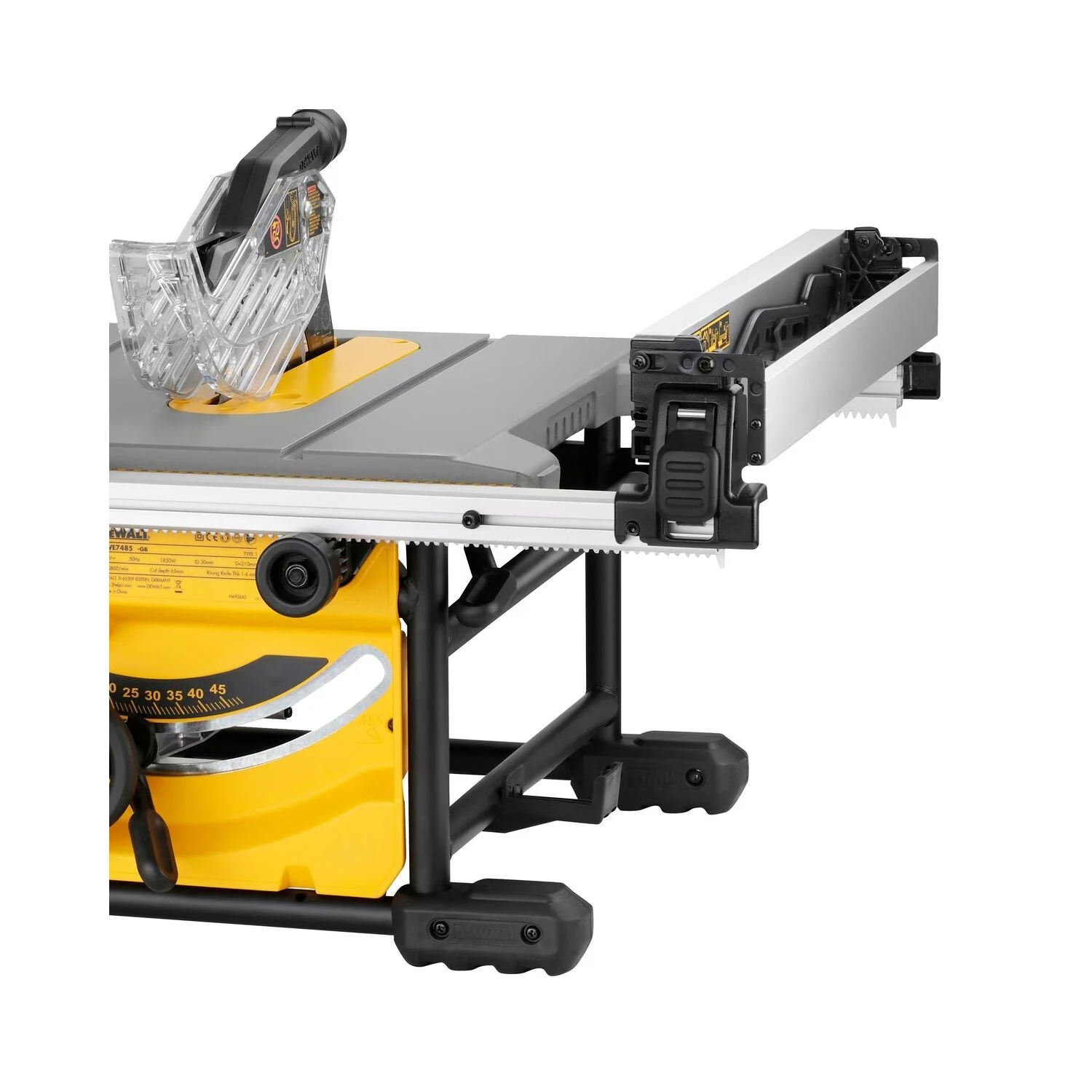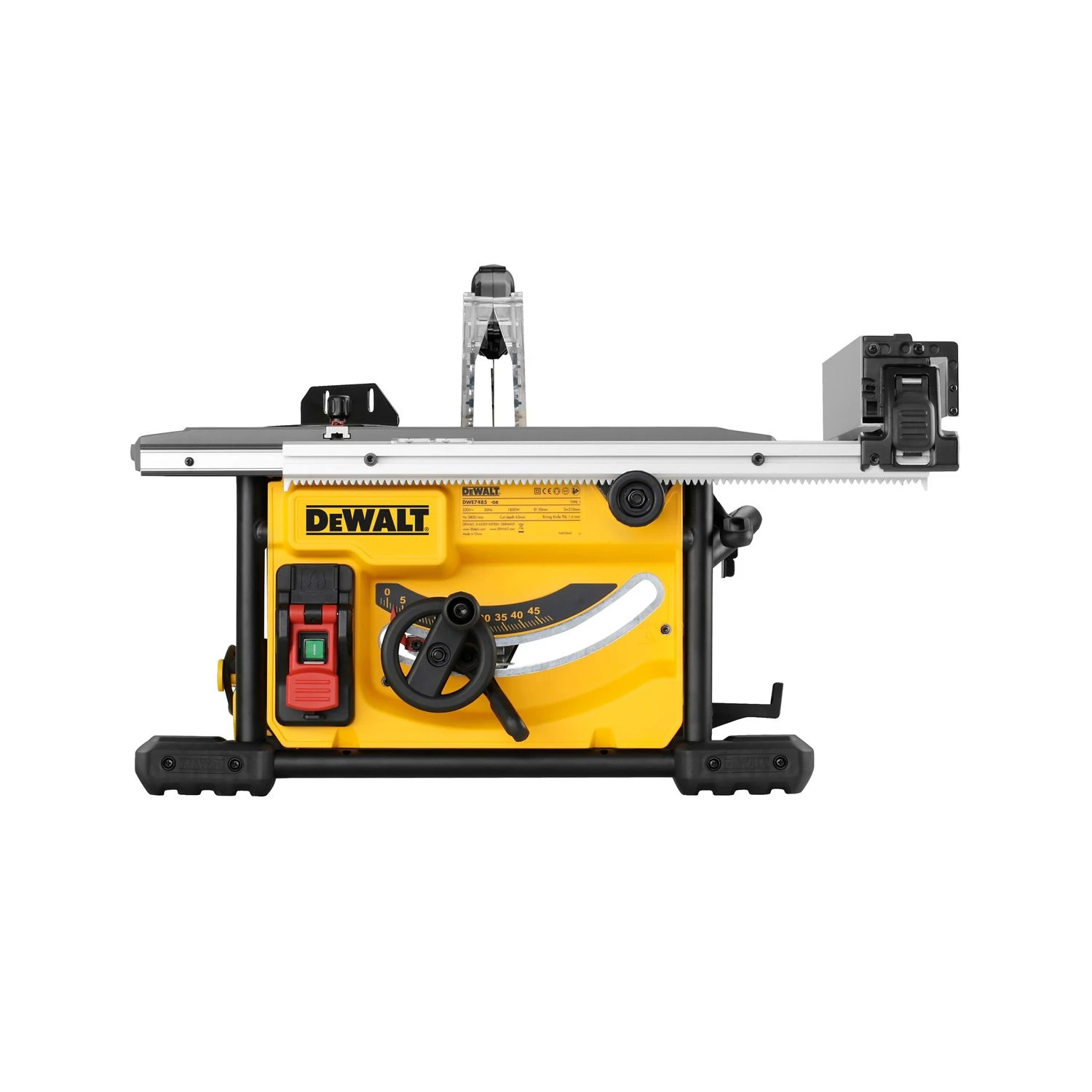 The DeWalt DWE7485 210mm compact table saw is an excellent addition to almost any tradesman’s kit. Ideal for cutting flooring to size, building fitted units, sizing timber for joinery, cutting plinths and more. The high power motor provides extended durability, efficiency and the power to cut all construction timbers. The Duel rack and pinion fence system provides increased accuracy whilst insuring no perpendicular movement occurs to the position of the fence in use. The two position fence offers increased capacity with max 622mm ripping capacity and allows for cutting of a wide range of materials/sizes. Supplied with 210mm blade.
