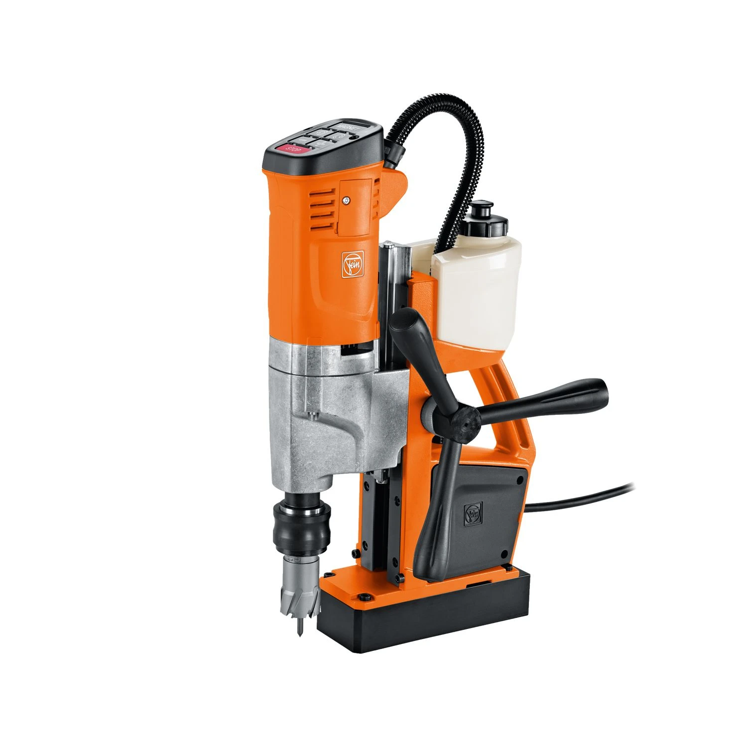 The Fein KBU 35-2 QW 110V Magnetic Core Drill is a compact and powerful high-speed universal magnetic core drill. It is robust and sturdy, with a swivel-mounted motor cable protection hose and 2-speed gearbox for twist drilling. The power-to-weight ratio is perfectly balanced, delivering a compact and lightweight tool with a FEIN 1 100 W high-power motor. Users can perform clockwise and anti-clockwise operations whilst completing tasks including countersinking and reaming, or core/twist drilling. The drill has a powerful magnetic holding force display with a 3-coil magnet, and an integrated coolant tank. Ideal for industry professionals.