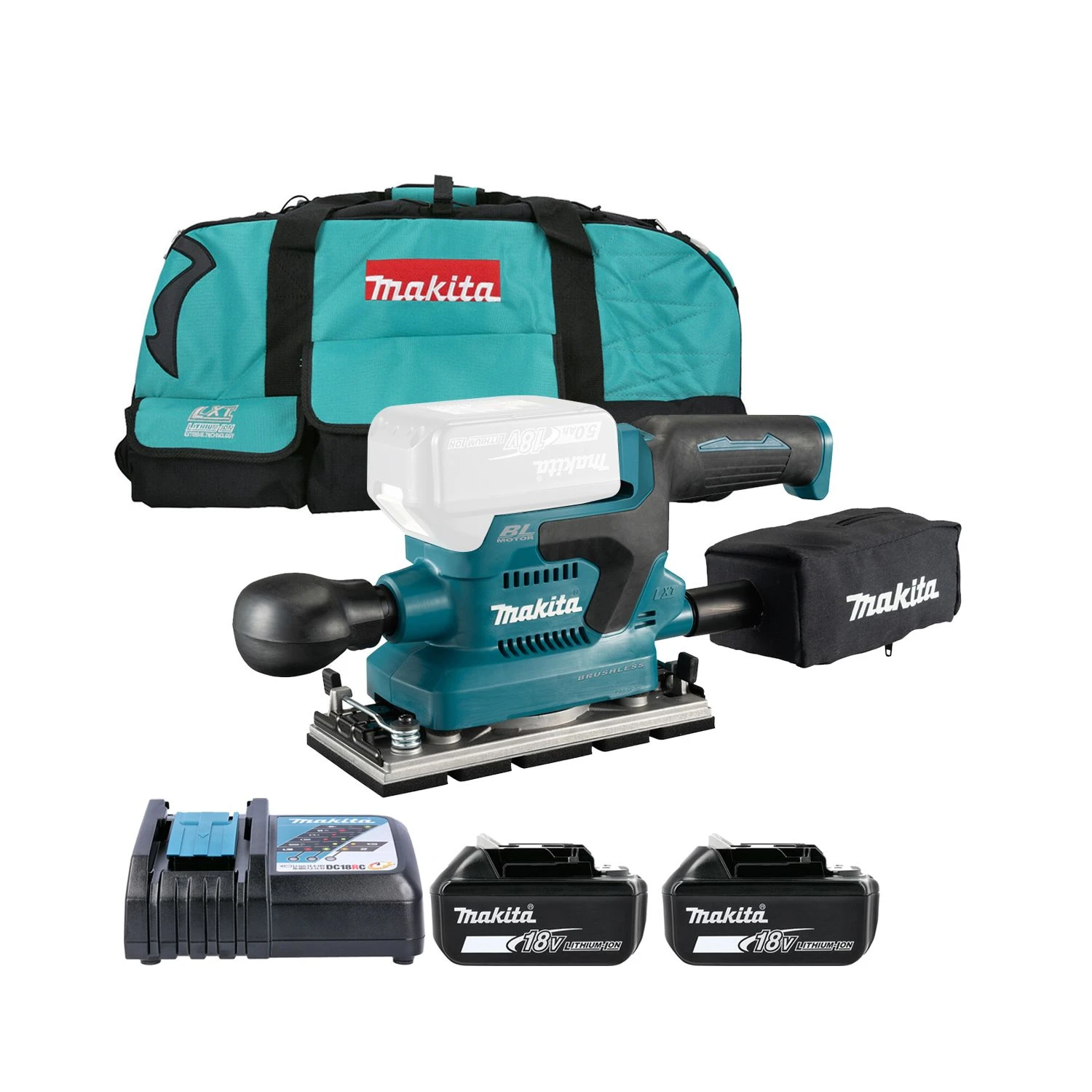 Makita DBO382 18V LXT Cordless Brushless Finishing Sander With 2 X 5.0Ah Batteries, Charger & LXT600 Tool Bag