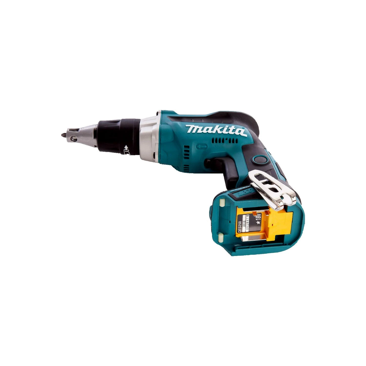 The Makita DFS250 drywall/plasterboard screwdriver features Push Drive Technology – with the lock-on button engaged the motor will not rotate under no-load conditions, resulting in reduced overall power consumption. The drive will start rotating at full speed only when the screw is pressured on the board surface.