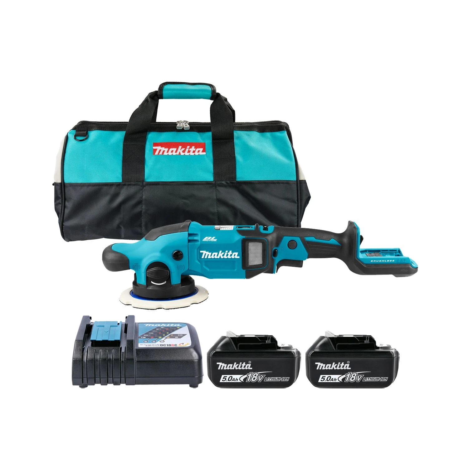 The Makita 18V 2×5.0Ah Random Orbit Polisher Kit is ideal for professionals and DIYers. Supplied with two 5.0Ah batteries to ensure there is enough battery charge to finish most jobs. The brushless motor provides maximum power even under load and longer tool life. The tool can be rested upside down without damaging workpiece thanks to the elastomer bumpers and the soft start provides a clean smooth cut. It is versatile with rotation mode change from random orbit to random orbit with forced rotation, this is to ensure the user is able to do rough polishing and fine finishing.
