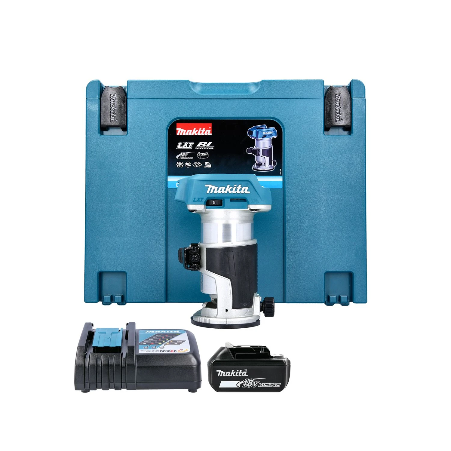 The Makita DRT50 18v LXT Li-ion Brushless Router / Trimmer. The Makita Brushless motor is precision engineered to be up to 50% more efficient than a comparative model. Without brushes in place to apply friction a Brushless motor can produce a greater measure of torque per weight making it ideal for both professionals and DIYers. With more torque at your disposal less power is required for day to day use, adding to the motors efficiency and extending the products overall lifetime as maintenance becomes less of an issue. Features include variable speed control dial with constant speed control, LED job light, push button with lock on/off. The Makita DRT50 are dust extractor compatible via the dust extraction nozzle so the user is able to enjoy a dust free working environment.