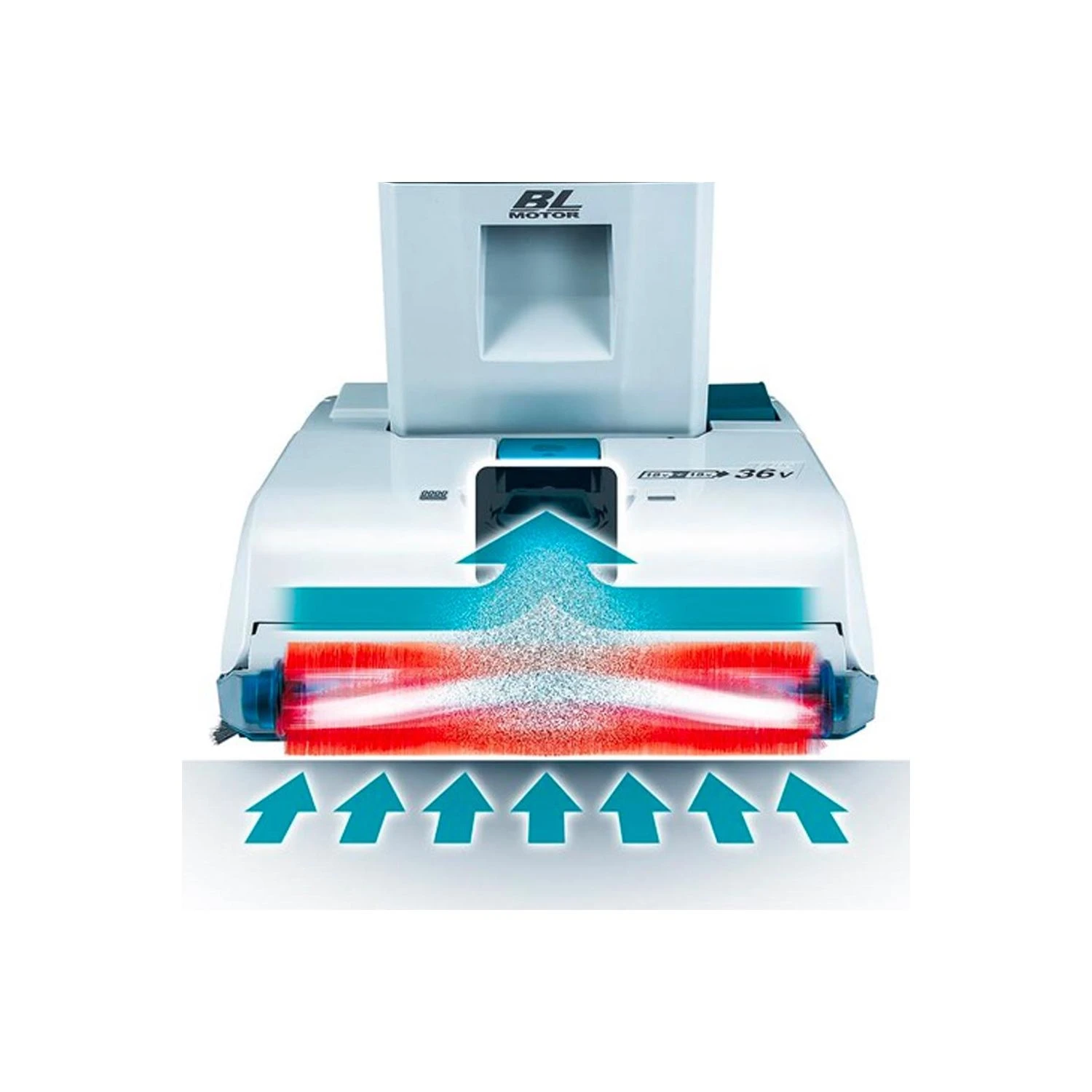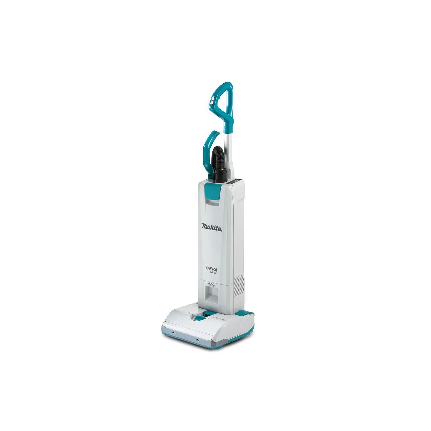 The Makita brushless vacuum Cleaner is a cordless cleaner powered by two 18V Li-ion batteries in series. This upright vacuum cleaner has an LED joblight fitted to aid with visibility so even when hoovering in low lit areas helping you to work more efficiently. The dust disposal warning light on this vacuum cleaner keeps you updated on the capacity of the dust collection bag and lets you know when best to empty the waste away. Similarly the brush roll error lamp on this lightweight hoover tells the user when there is an issue with the brush roll, whether that’s something wrapped around or if it’s a bigger error. The battery warning lamp lets the user know through stages of blinking the state of the battery capacity and when to charge it. The carrying handle on this brushless upright vacuum allows for easy mobility and portability so you can easily operate in any area. The HEPA filter system on this Makita brushless vacuum is perfect for minimizing dust and other small particles for clean air. This vacuum also features 3 speed setting, front bumper protectors, 90 degree tilting capacity, two different BL motors, expandable hose and the automatic stop of the brush roll when not needed to prevent damage.