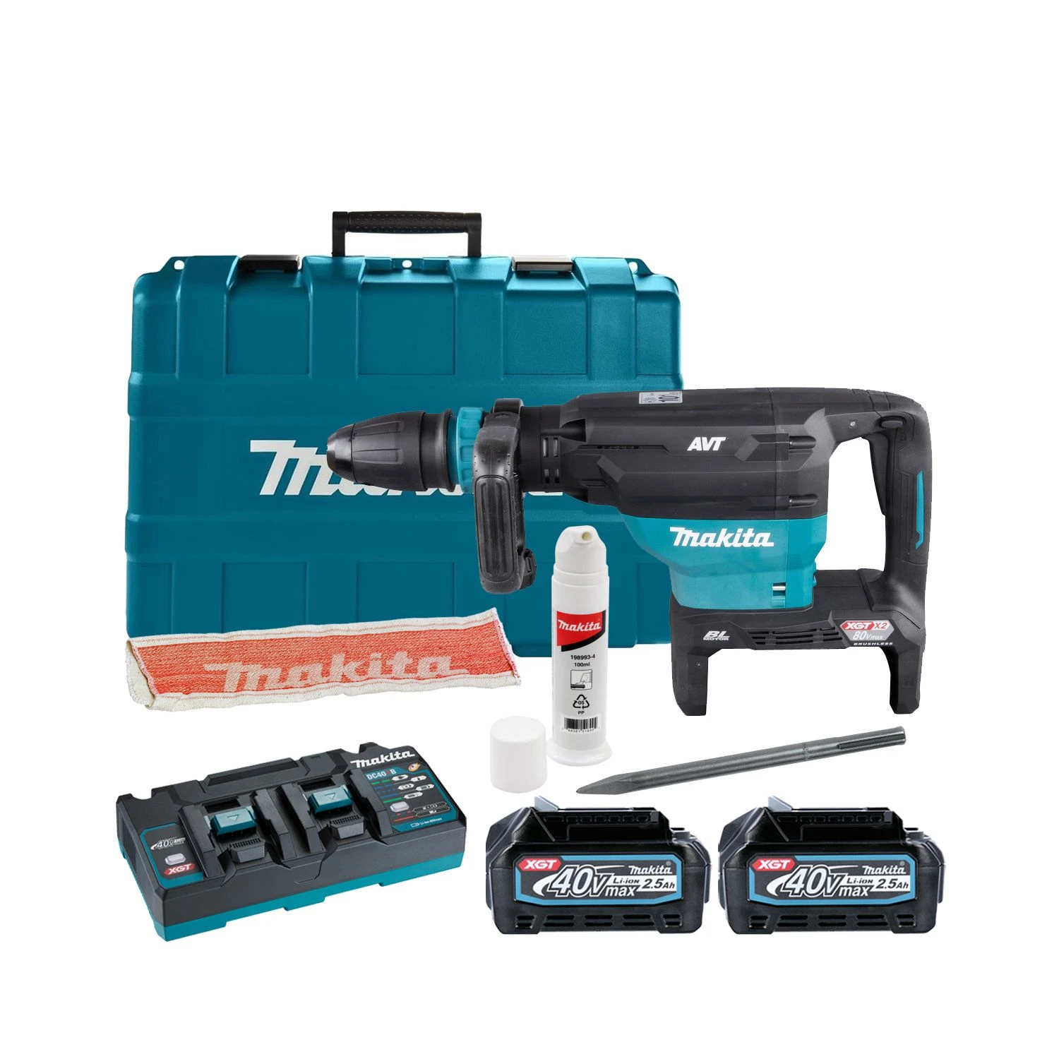 The Makita HM002GD203 is a cordless demolition hammer, powered by 2x Makita 40v Max XGT Li-Ion battery packs, and using an SDS Max tool holder. Delivers the strength and power of a brushless motor whilst also reducing user fatigue and noise with it’s anti-vibration housing.