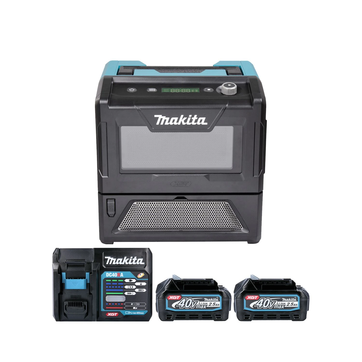 The Makita MW001G Cordless Microwave is powered by 40v Max XGT Li-ion battery (two in parallel or one). The 350W / 500W will run from one or two 40v batteries and will use the power sequentially so that you can have continuous power when you need it. Heats food at 500W as well as a mains domestic microwave. The output of 500W power is a temporary boost function – it automatically switches to 350W power after about 8 minutes. Features a reminder alert. If the microwave door is not opened for 1 minute after heating a sequence of 3 short beep sounds every 1 minute to 2 minutes notifying user items are left in the microwave. Tempered glass in the door as well as dust and water resistence ensures the microwave is up to day to day site use. The microwave is easy to clean up and maintain.