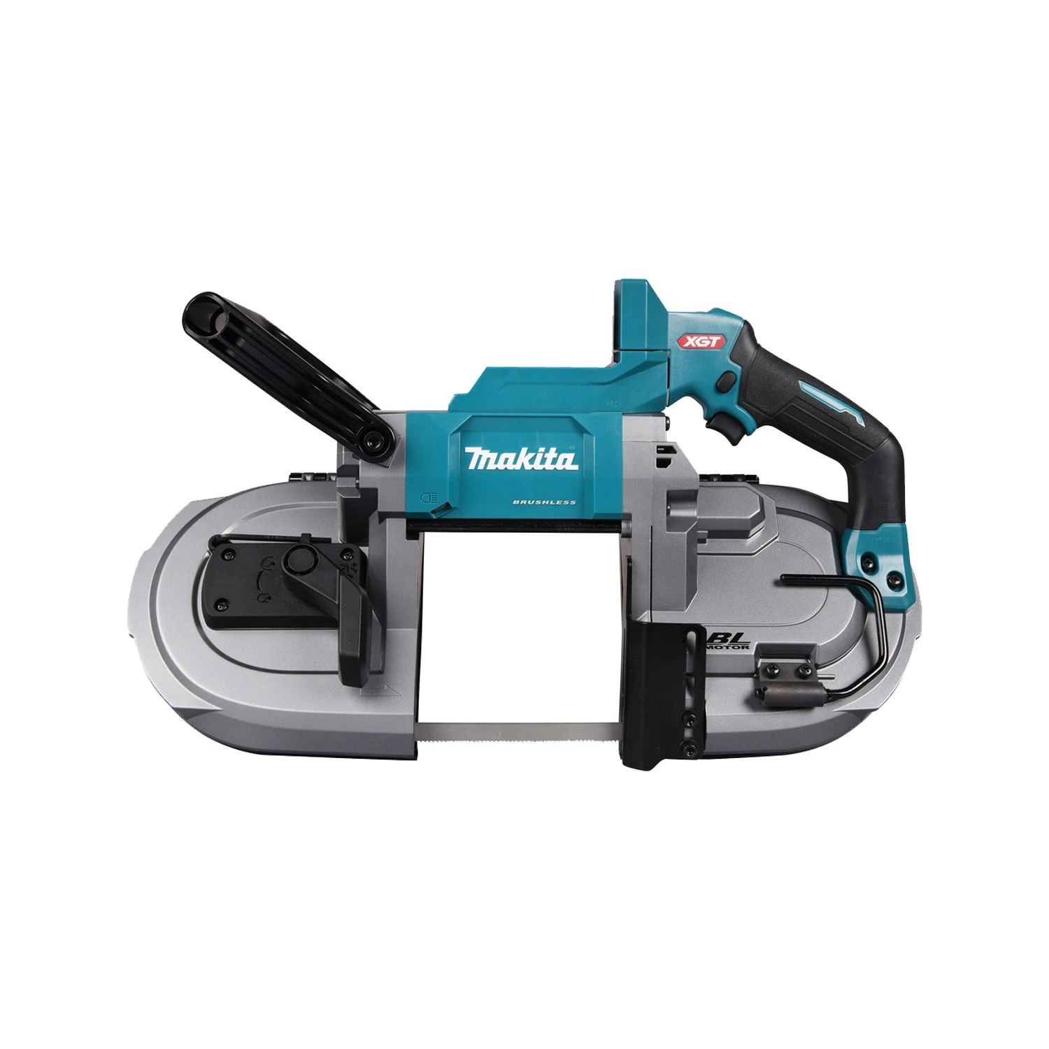 The Makita PB002GD101 is a cordless band saw powered by a 40v Max XGT Battery. This band saw is designed mainly for cutting 4″ to 4-1/2″ steel pipes efficiently. The belt speed is electronically adjustable and reaches up to 3.2 m/min. The machine is very robust due to the stable bridge construction with an aluminium frame.