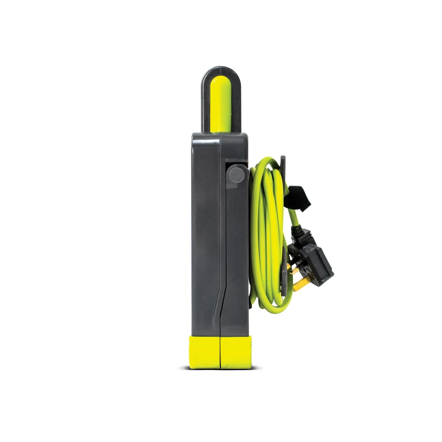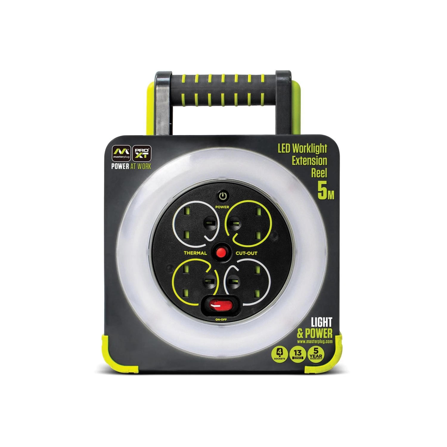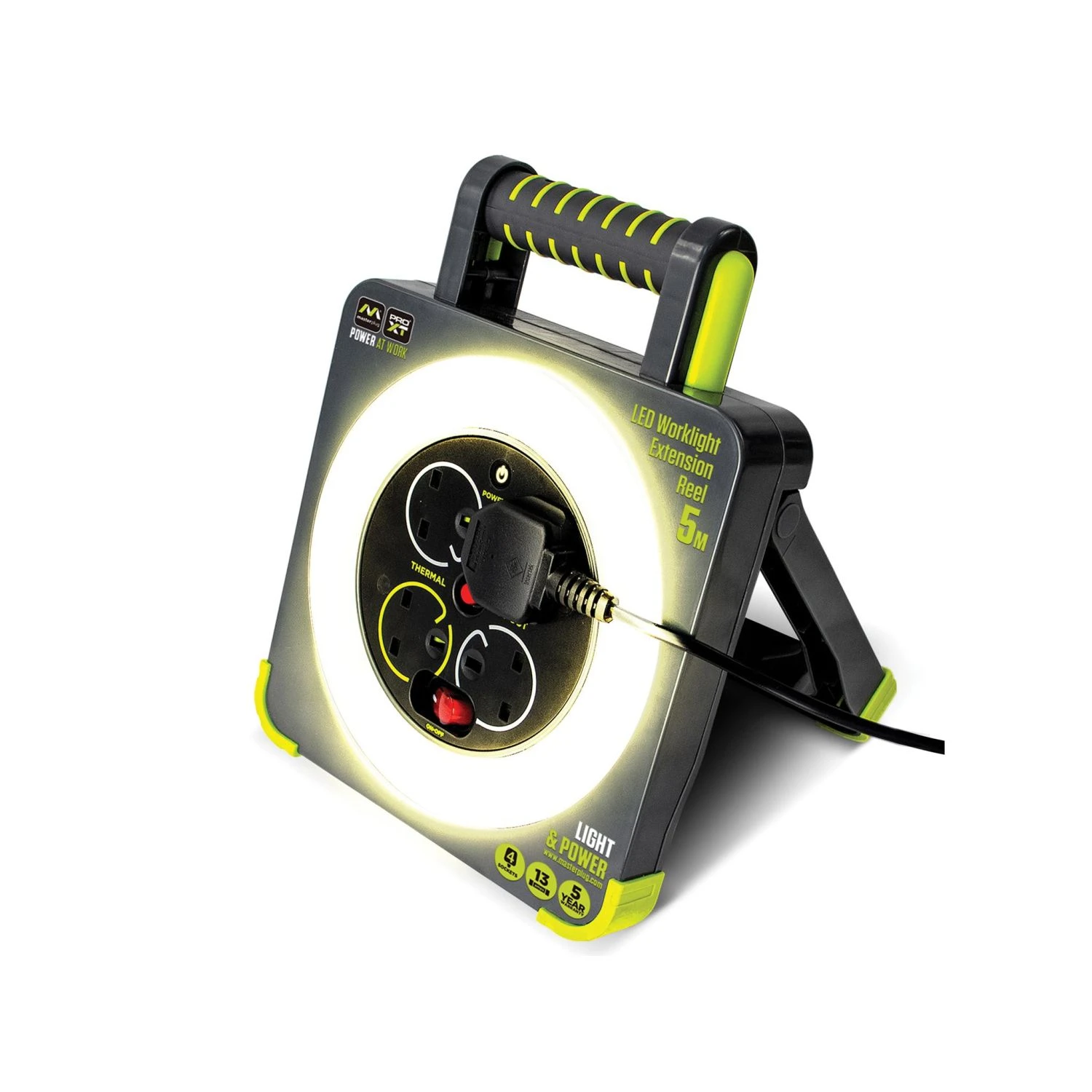 The Masterplug Work Light Cable Reel provides both light and power for home and heavy-duty applications. The handy work light provides 550 lumens of light. Its 4 shuttered sockets feature power control and a status indicator. Designed and engineered for longevity, a fold-out stand and ground touch points with grips help to ensure stability. It also features an ergonomic carry handle and 5 metres of highly visible green cable.