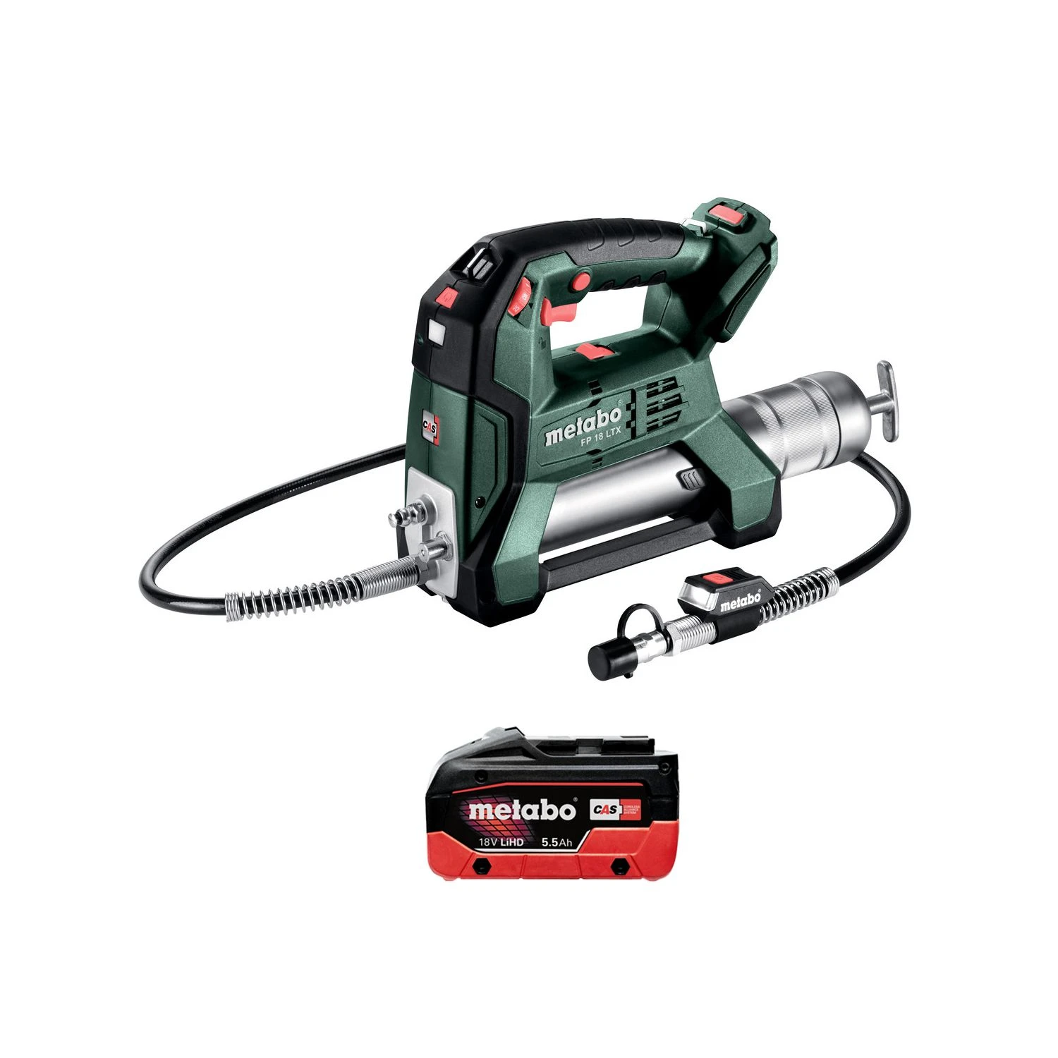 The Metabo 600789850 FP 18 LTX 18V LXT Grease Gun Bis a brilliant tool for professional mechanics. Whether you are lubricating a door hinge or changing oil this tool offers you both high and low-pressure flow rates to give you more choice. This 18V grease gun has a discharge pressure of 690 / 413 bar with a speed of 290 / 100 g/min. To ensure cleaner working a thumbwheel with ten settings modifies the discharge pressure and the integrated bleeding valve affords constant work progress. Weighing only 4.4kg with a battery pack, this lightweight and compact tool will allow you to work comfortably in tight spaces while the 1200mm long hose will give you more access and room for manoeuvre. The LED light is powerful enough to illuminate dark areas so you can work in dim areas safely and accurately.