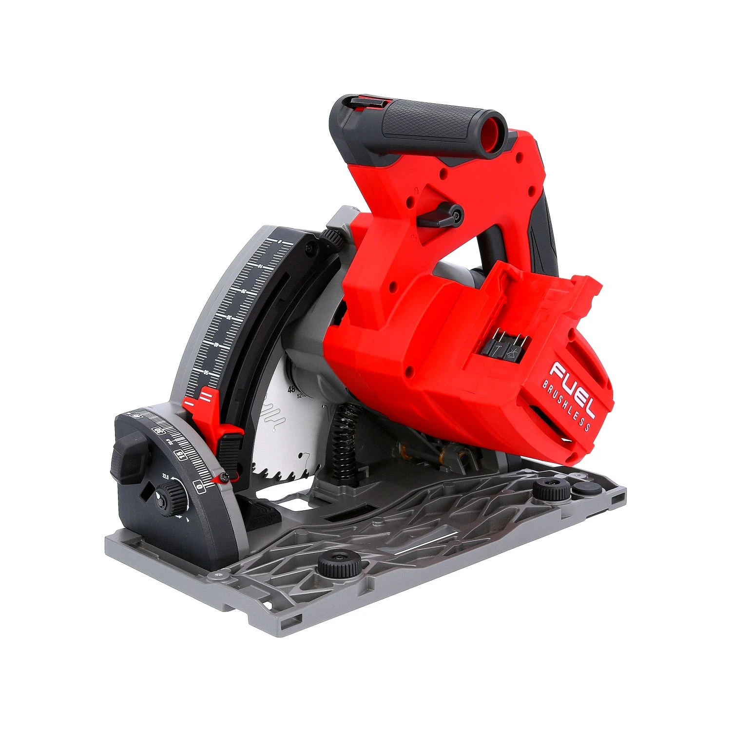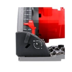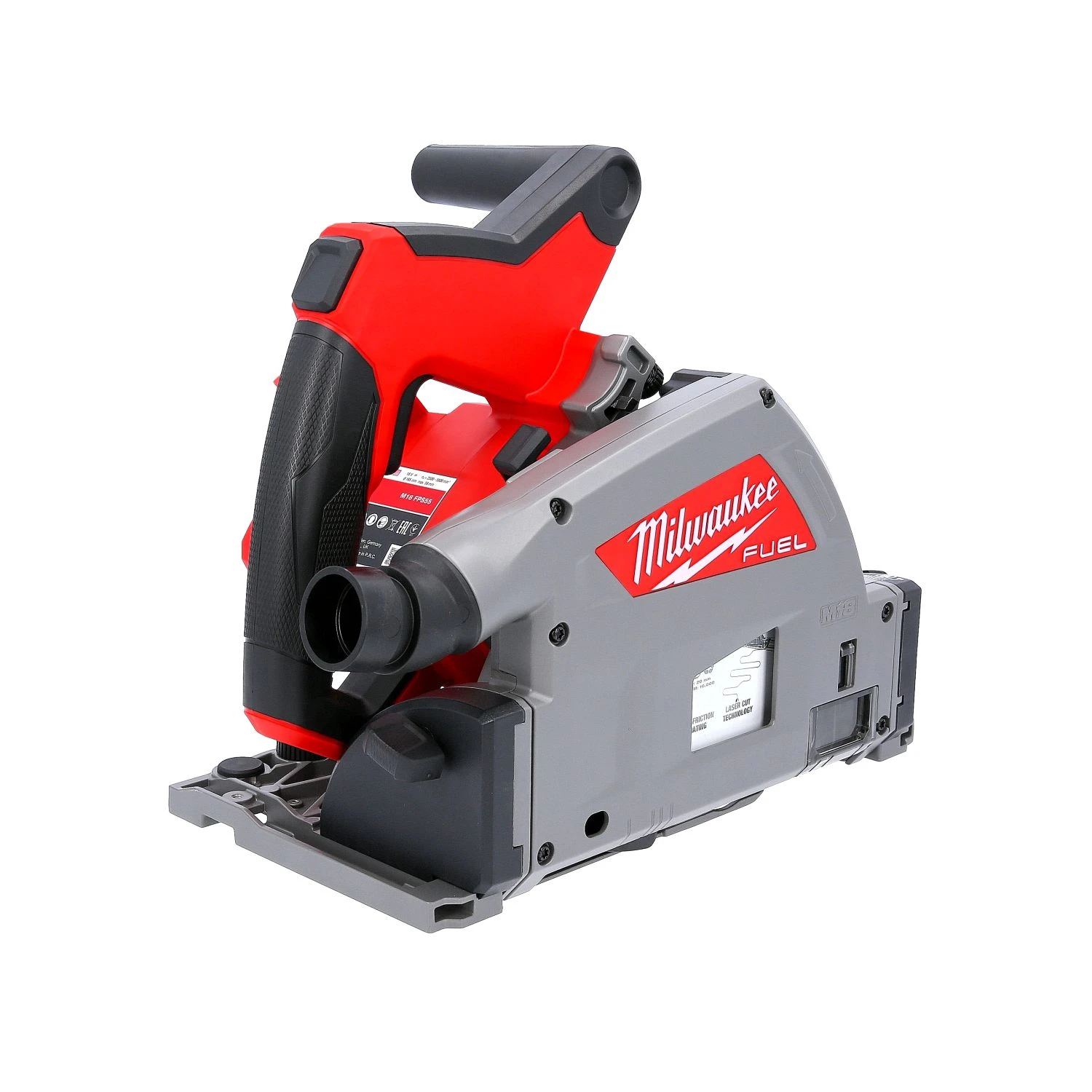 The Milwaukee 4933478777 M18FPS55-0P 18V 165mm Plunge Saw. A cordless power tool that makes efficient plunge cuts and long cuts into thick boards. An ideal tool for carpenters, joiners and kitchen fitters it has a depth adjustment with two scales. These can be easily adjusted by the press of a button and there is also a bevel adjustment which has stops at 22.5°, 45°and 48°. To keep the site clean and safe this saw has an enclosed guard to keep away dust and it also comes with a dust bag. With a no-load speed of 2500-5600rpm and a maximum cutting depth of 44mm at 45° it provides quick and efficient working. It is sold as a bare unit without batteries or chargers, but it does come with a PACKOUT toolbox for storage and transport.