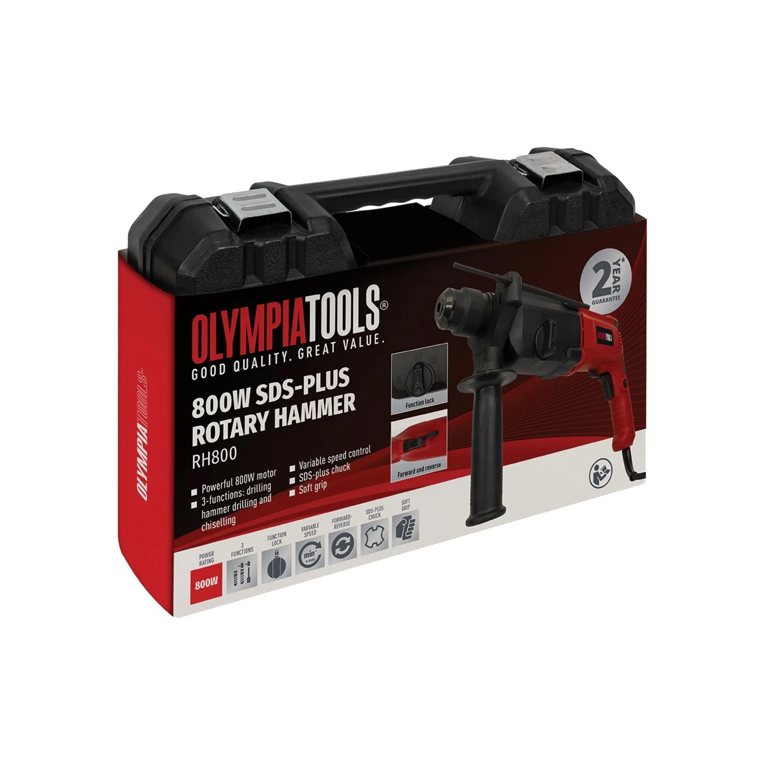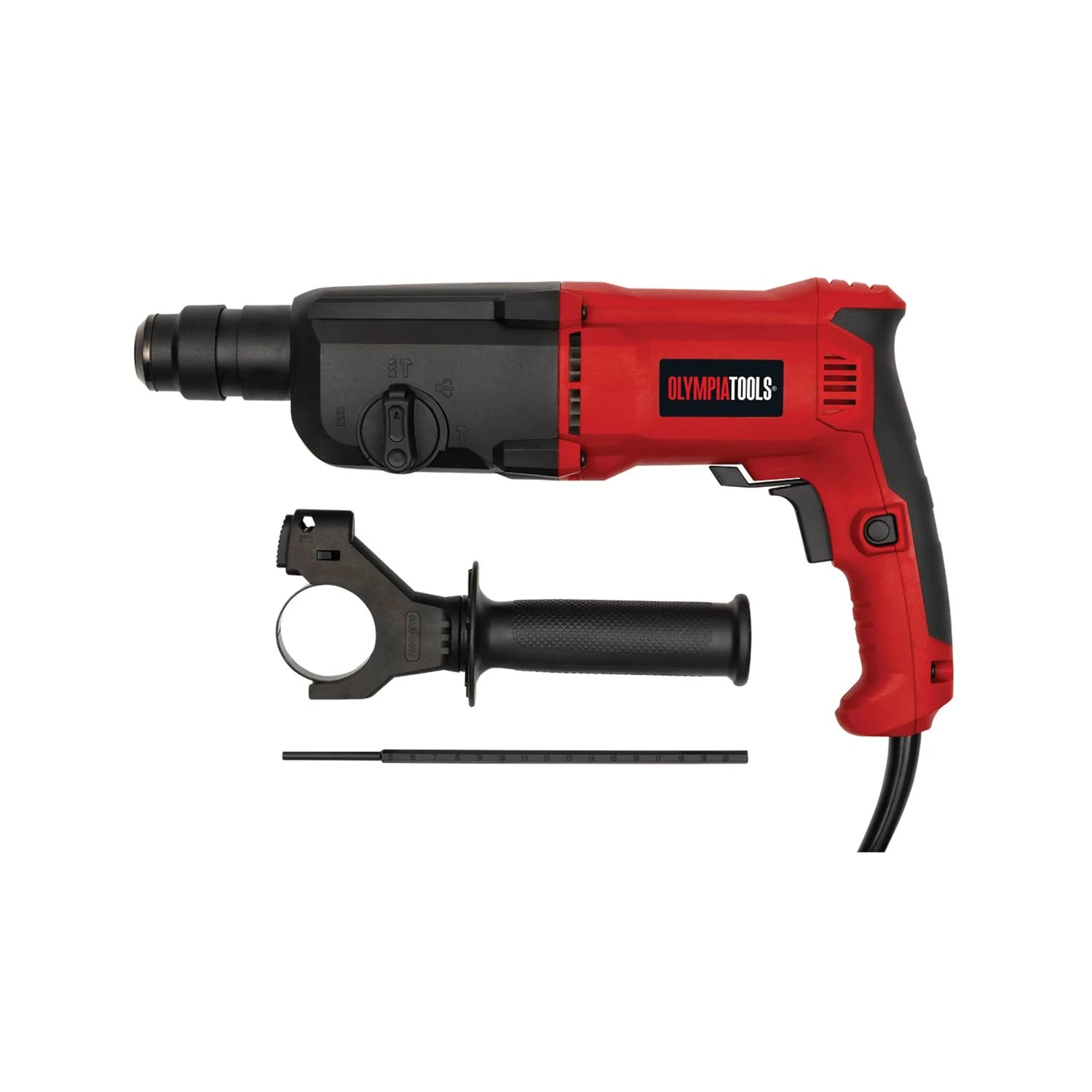 The Olympia Tools® SDS Plus Rotary Hammer is fitted with a powerful 800W motor and offers 3-functions: drilling, hammer drilling and chiselling. A function lock provides additional safety. It has a variable speed for additional control and job customisation, and also a forward-reverse function. Its easy-to-handle design incorporates a soft grip handle for reduced fatigue.