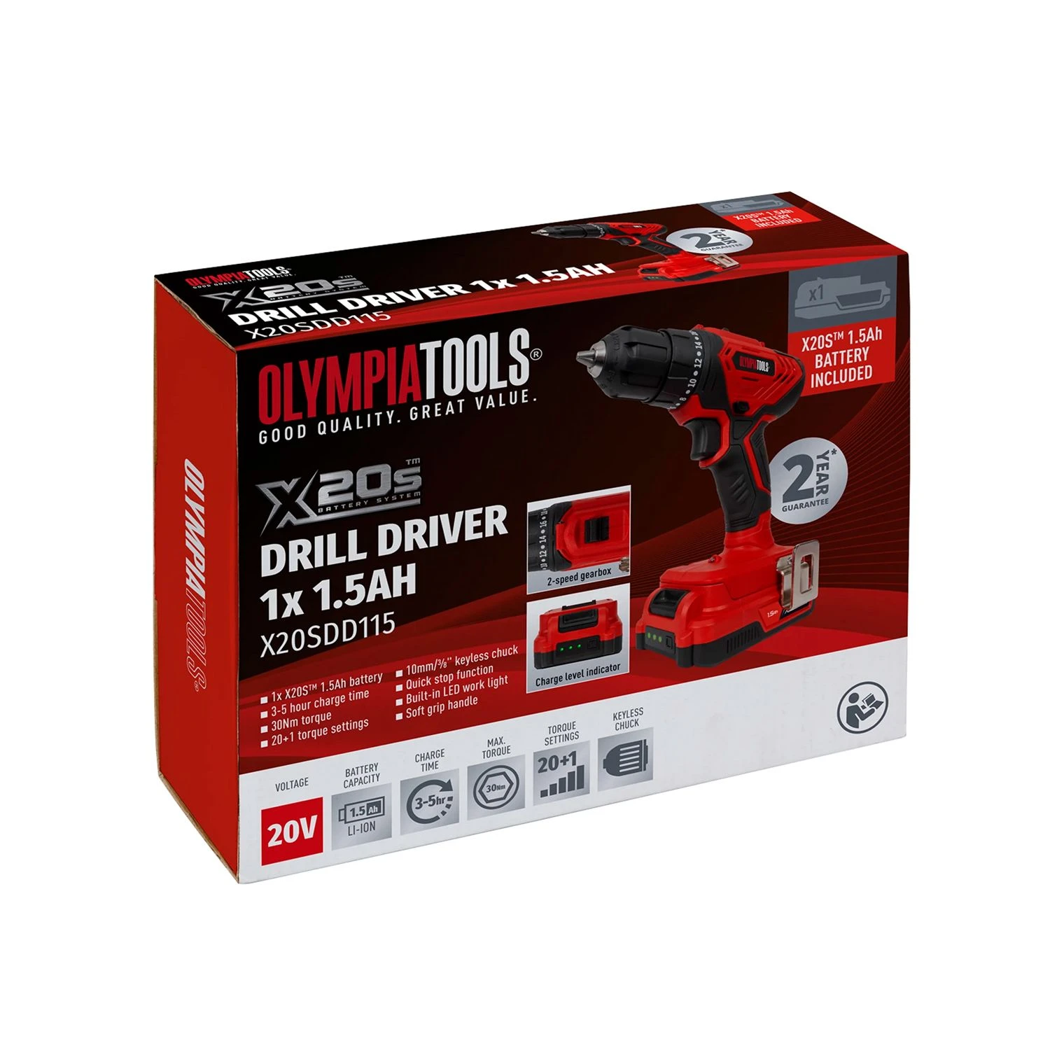 The Olympia Tools® X20S™ Drill Driver has a 2-speed gearbox and a quick-stop function that improves user safety. Fitted with a soft grip handle for reduced fatigue and increased control. There is also a handy LED work light, ideal when working in dark spaces.