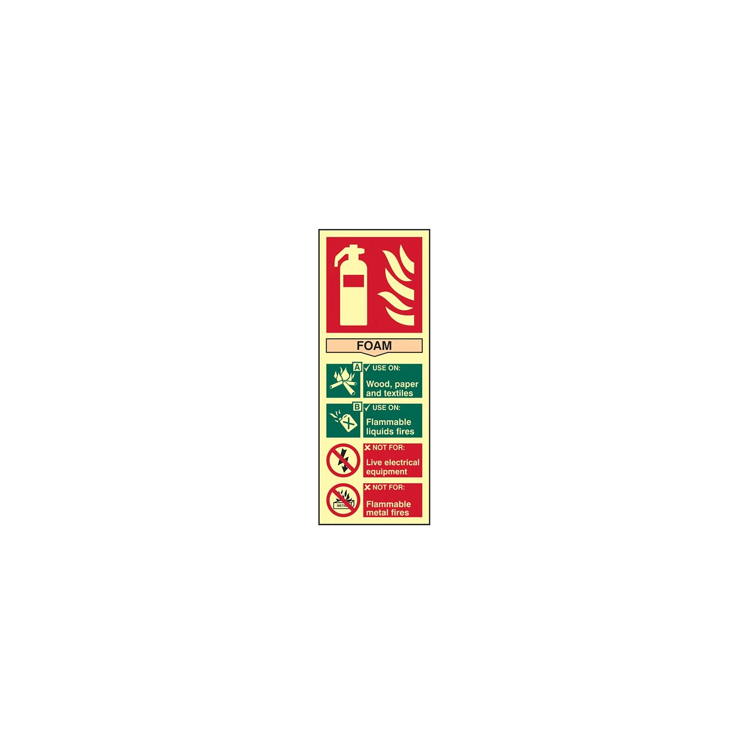 This Scan ‘Fire extinguisher composite’ safety sign is for foam extinguishers, and measures 75 x 200mm. It is printed on 1.3mm thick, rigid material with UV resistant inks to prevent fading. The sign is photoluminescent, which means that it will glow in the dark. The PVC sign is self-adhesive, making it easy to attach to any wall. It is perfect for alerting people to and providing guidance on the uses of foam fire extinguishers.