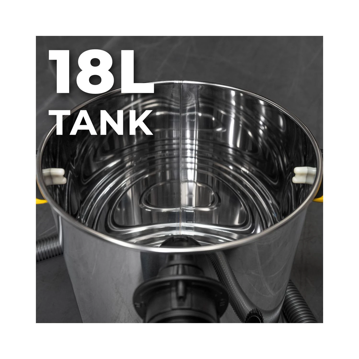 - Compact and Durable: Irrespective of the size of your home, with this wet and dry vacuum cleaner, it’ll be easy to move around. Its easy-to grip top carry handle and supportive castors allow for portability and hassle-free cleaning. Equipped with a stainless steel 18L tank, it’s also resistant to impact and tipping.