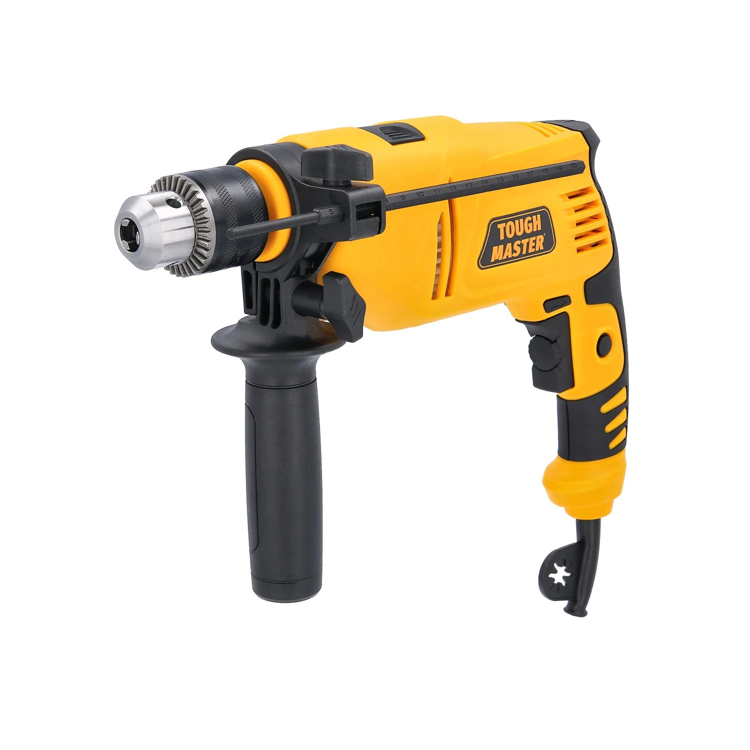 Get the best of both worlds with this versatile impact drill from TOUGH MASTER®. The TM-ID800E Impact Drill has hammer drill function for drilling into masonry, stone or concrete. When working for long periods, you can reduce fatigue by engaging the lock-on button, which means that you don’t have to continuously hold the trigger switch when drilling or driving; and we all know that less fatigue means safer operation. This Impact Drill with hammer drill function comes with a range of accessories: There’s a removable / adjustable auxiliary handle to give you extra hold when working. To fit different drill or driver bits into the 13mm metal chuck, use the included chuck key. Drilling to a precise depth with this impact drill is easy: Just use the included depth gauge. When the carbon brushes for this corded impact drill need replacing, use the brand-new pair that comes included with this impact drill to make maintenance even easier. This corded impact drill with hammer drill function has a powerful 800W 100% copper motor that provides plenty of torque for even the most demanding projects. Use its drill function to drill into / drive screws into wood or sheet metal. Control the drill’s speed with the rotation selection dial and the variable speed trigger for speeds up to 3000rpm. To switch between the hammer and drill functions, use the mode switch on this impact drill.